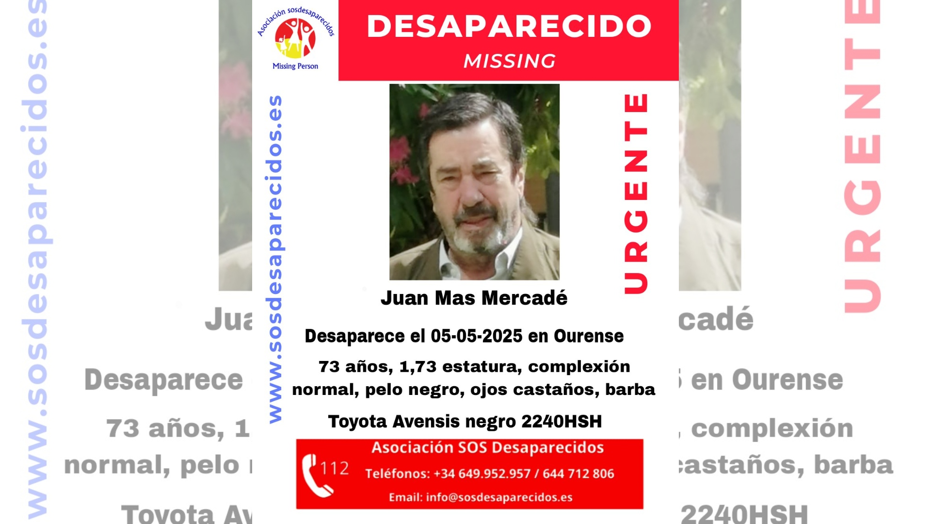 La asociación SOS Desaparecidos ha lanzado un aviso para localizar a Juan Mas Mercadé, un hombre de 73 años que fue visto por última vez el lunes 5 de mayo en la ciudad de Ourense.