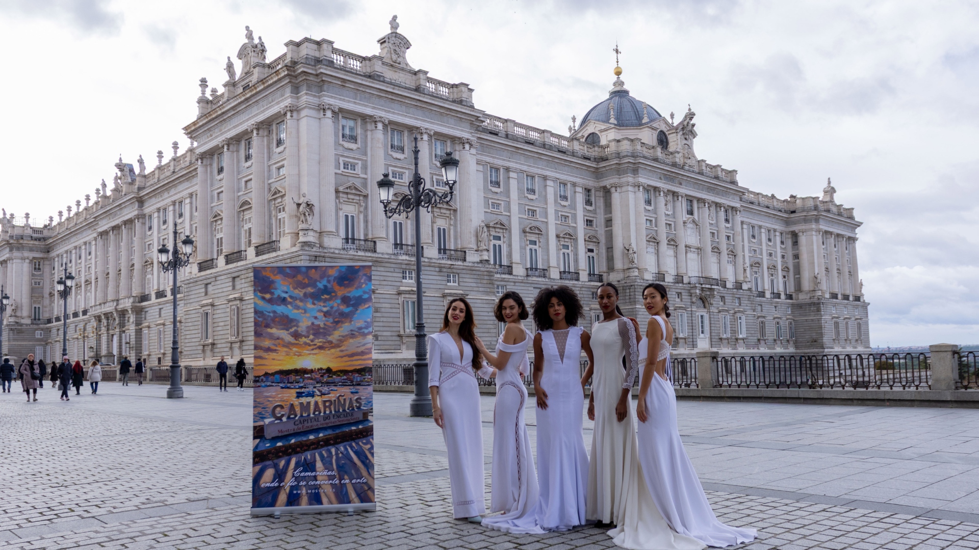Con el objetivo de mostrar la modernidad y el carácter innovador del encaixe de Camariñas, el Concello organizó una sesión fotográfica en algunos de los puntos más emblemáticos de la capital. La azotea del Hotel RIU Plaza España, con vistas panorámicas de Madrid, la Gran Vía frente a las pantallas del Teatro Lope de Vega y los alrededores del Palacio Real se convirtieron en una pasarela urbana excepcional.