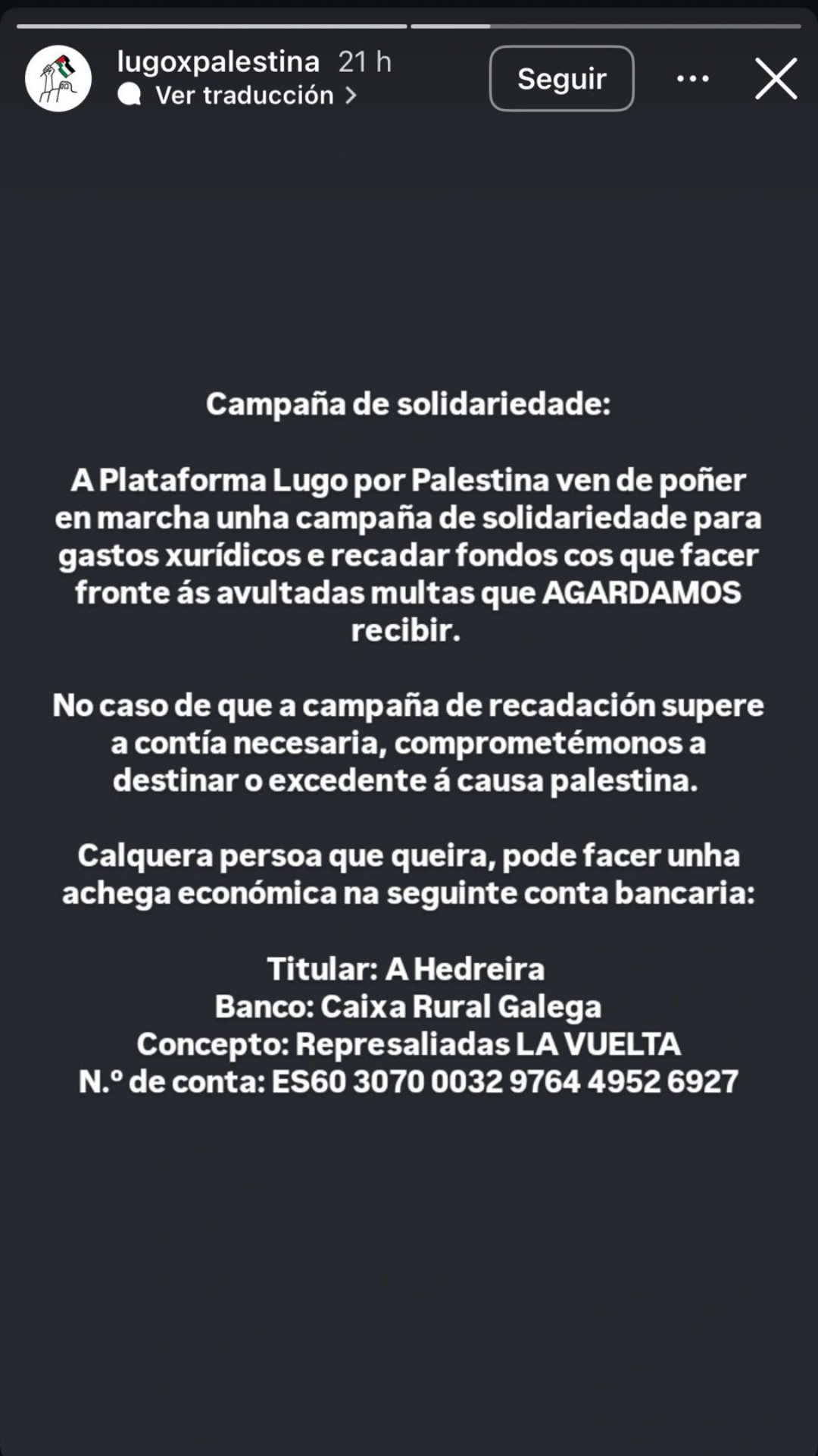 La cuenta habilitada para donaciones es Caixa Rural Galega ES60 3070 0032 9764 4952 6927, donde quienes deseen colaborar pueden contribuir a esta campaña de apoyo.