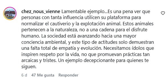 Las críticas no se han limitado a comentarios aislados. Bajo sus publicaciones se ha ido acumulando una cadena de mensajes que cuestionan directamente estas prácticas y el papel de los deportistas como referentes públicos. Algunos usuarios hablan abiertamente de “maltrato animal” y de “explotación de especies salvajes con fines turísticos”. Otros señalan la normalización de comportamientos que no serían aceptables en otros contextos, como posar con animales encadenados o separados de su entorno natural. “Los tigres, leones o chimpancés no son atrezzo para selfies”, apunta un usuario.