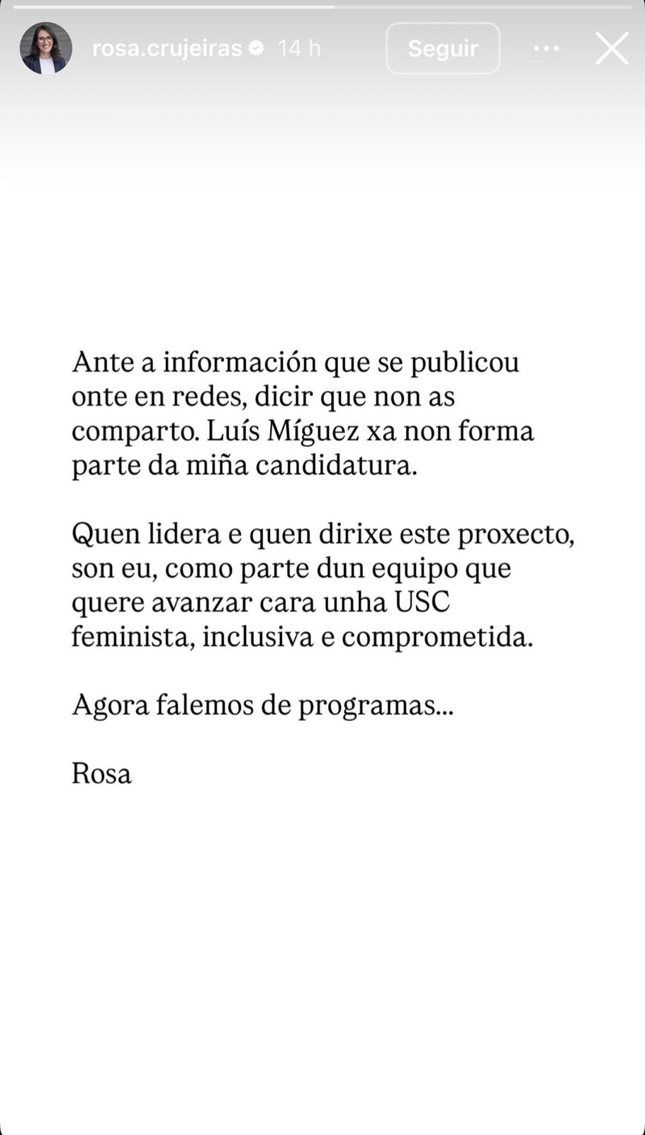 La candidata al Rectorado de la Universidade de Santiago de Compostela, Rosa Crujeiras, ha decidido prescindir de Luis Míguez en su equipo electoral. Así lo comunicó este martes mediante una publicación en redes sociales, en la que subrayó que la dirección del proyecto recae exclusivamente en ella.
