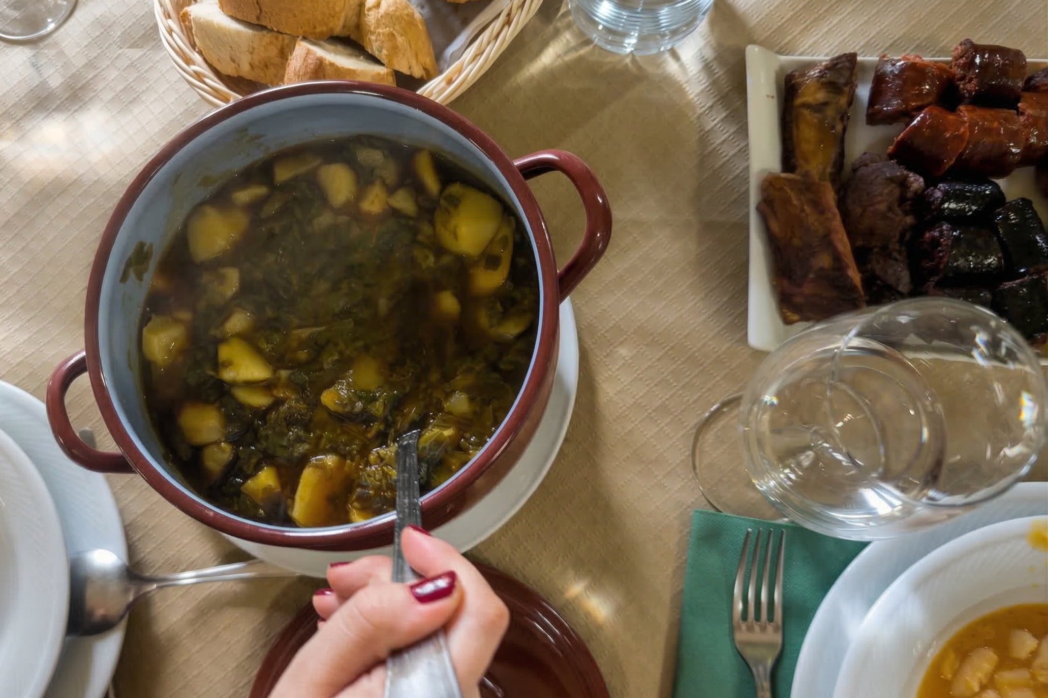 En Casa Manolo aparecen platos que dibujan muy bien esa identidad local: sopa de gallina, pote tevergano, fabes con compango, callos, picadillo, ternera y postres caseros. Es una cocina de montaña, de cuchara, de invierno largo, de energía y de tradición. Una cocina que no necesita grandes artificios porque su fuerza está en el sabor y en la continuidad con la vida cotidiana del lugar. El pote tevergano, en particular, es uno de los grandes nombres del recetario local y uno de esos platos que ayudan a fijar la memoria de un territorio. Se prepara con berzas, patatas y compango —chorizo, morcilla, tocino y lacón—, y resume muy bien esa cocina asturiana poderosa, rotunda y profundamente ligada al paisaje del que nace.