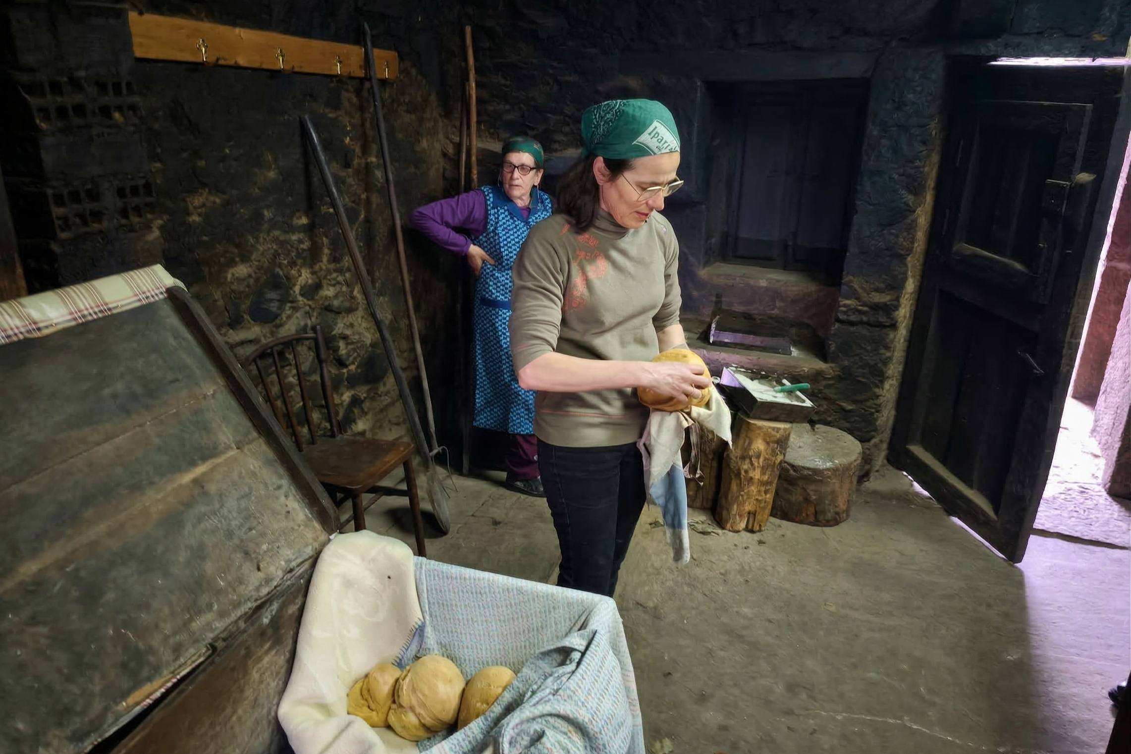 Muy cerca de ahí aparece otra de las experiencias más valiosas del fin de semana, y seguramente una de las que mejor condensan el alma del concejo: la visita a casa de Blanca y sus hijas, donde se desarrolla una actividad de pan artesanal que va mucho más allá de un taller al uso. Blanca nació en esa misma casa, justo al lado del horno donde se sigue haciendo el pan, y lleva más de setenta años elaborándolo. Entrar allí es entrar en una vivienda donde el oficio sigue vivo, donde no hay una representación para el turista, sino una continuidad real de la vida de siempre. La experiencia permite amasar, conocer el proceso, entender los tiempos y participar también en la preparación de bolla preñada con productos que la propia familia elabora, ya que también son una familia ganadera.