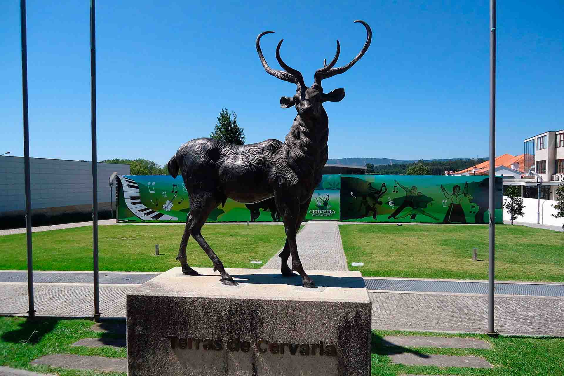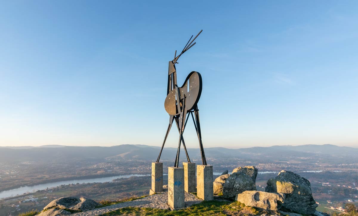 Antes incluso de entrar en el núcleo urbano, el visitante percibe una presencia simbólica que define el carácter del lugar: la silueta de un ciervo en lo alto del monte, visible desde distintos puntos del valle. No es un detalle menor ni un simple ornamento paisajístico. Se trata de un monumento que remite directamente a la leyenda fundacional de Cerveira, vinculada a la abundancia de ciervos en la zona y al propio nombre de la villa. La figura, instalada en un mirador estratégico, parece observar el curso del Miño, como si vigilara el territorio desde una atalaya natural. Para quien llega desde Galicia siguiendo el río, ese ciervo funciona casi como una señal de bienvenida y como recordatorio de que aquí el paisaje y el imaginario colectivo están profundamente entrelazados.