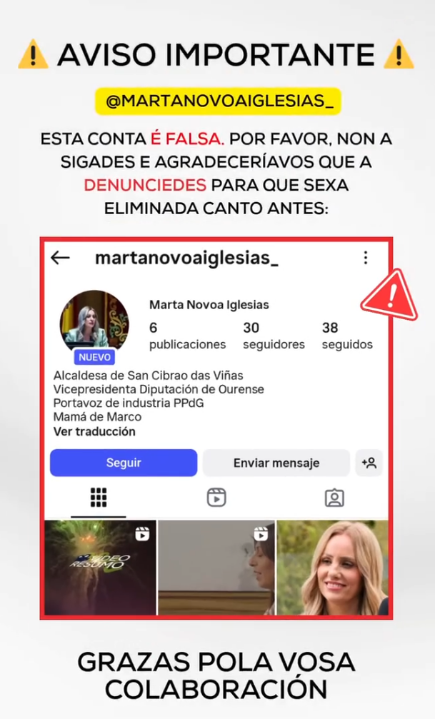 Marta Nóvoa, alcaldesa de San Cibrao das Viñas, ha denunciado que su cuenta de Instagram ha sido clonada con el fin de realizar una estafa relacionada con criptomonedas.