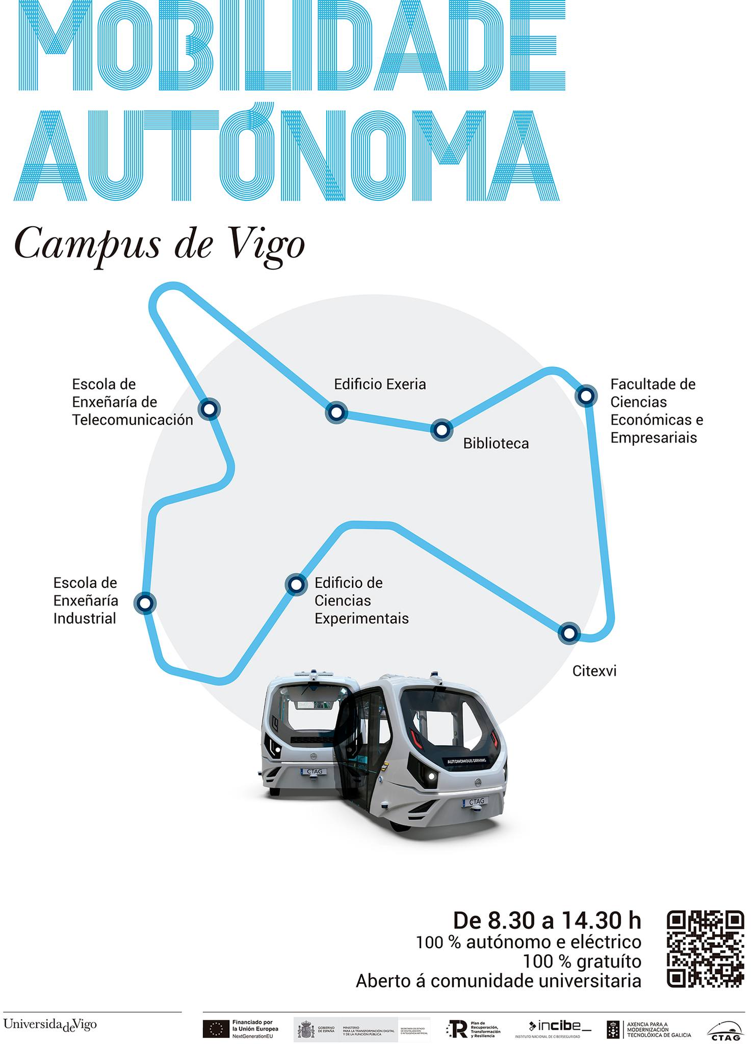 Con capacidad para ocho ocupantes, el vehículo realiza paradas en puntos clave del campus: la Escuela de Ingeniería de Telecomunicación, el edificio Exeria, la biblioteca central, la Facultad de Ciencias Económicas y Empresariales, el CITEXVI, la Facultad de Ciencias Experimentales y la Escuela de Ingeniería Industrial.